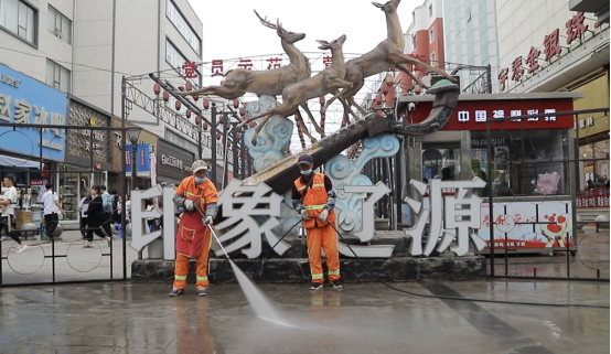 在平安广场、东方广场、市中心步行街路口等市民休闲娱乐密集区域,环卫工人们认真打扫着道路卫生,一派繁忙景象,热闹非凡。同时,机械化清洗作业车辆也忙得“不亦乐乎”,小型高压冲洗车辆、小型无尘洗扫车循环冲洗清刷作业模式,车辆所过之处洁净如新。