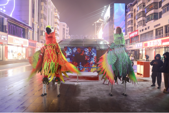 沿街巨型机甲霸气亮相,与市民趣味互动;无人机编队凌空巡航,飞龙飞凤腾空而起,冷焰火、彩虹机次第绽放,光影交织、流光溢彩,将节日氛围推向高潮。市民们扶老携幼、驻足观赏,用手机定格精彩瞬间,欢声笑语回荡在东辽河畔。